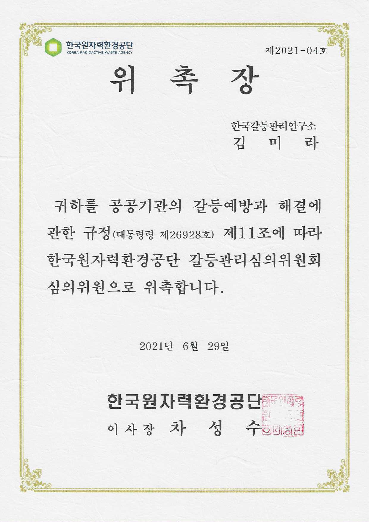 홈연구소 소개주요성과 주요성과 【위 촉】"갈등관리심의위원회 심의위원 " 한국원자력환경공단 작성자 연구소 상담실장 작성일 2022-01-26 02:57 조회 221 좋아요 0 싫어요 0 인쇄 « 【위 촉】"인권경영위원회 외부위원" 인천도시공사 【위 촉】"갈등관리심의위원회 위원" 해양경찰청 » 목록보기 답글쓰기 Powered by KBoard