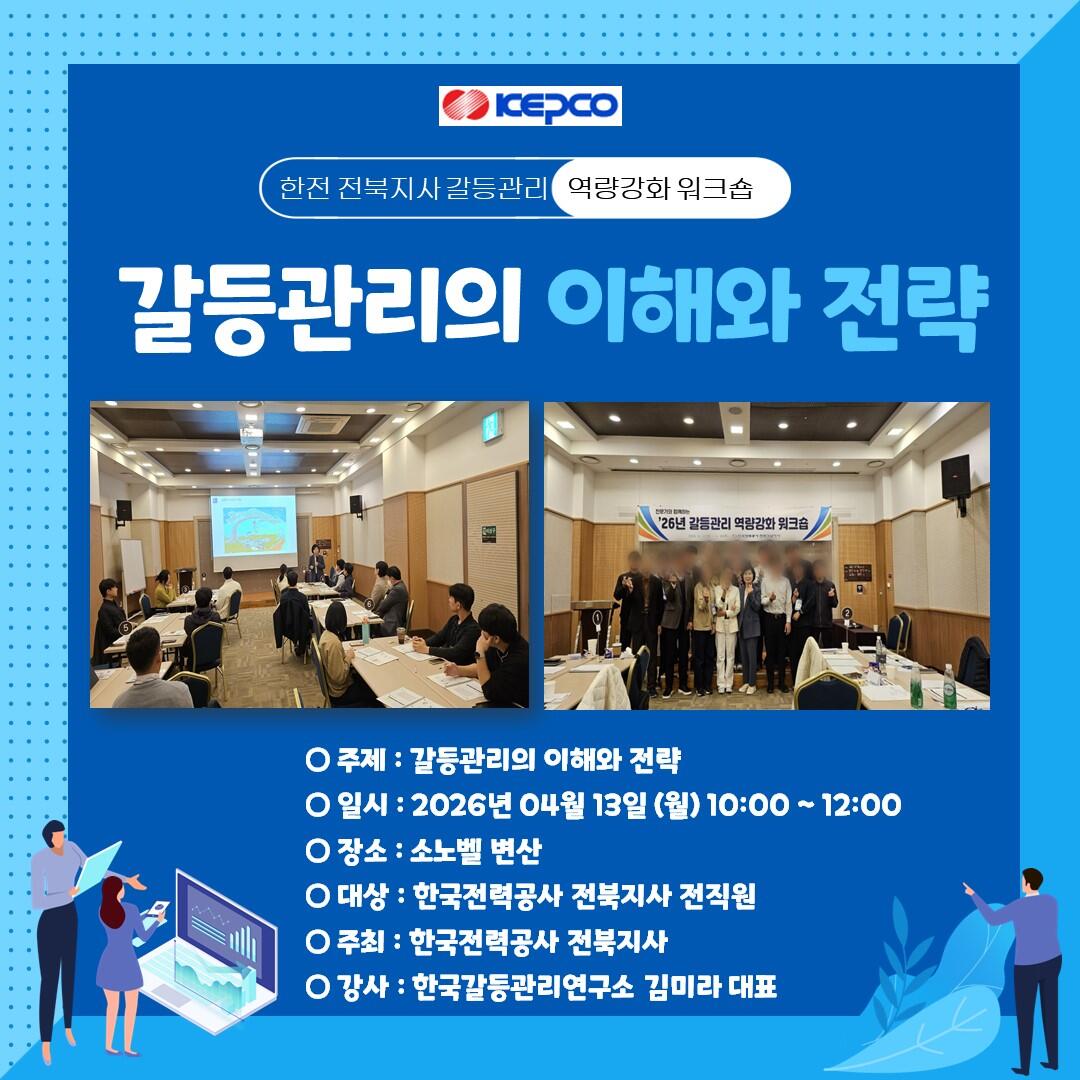 2026년 4월 13일(월)부터 4월 16일(목)까지 한국전력 전북지사에서는 전 직원을 대상으로 ‘2026년 갈등관리 역량강화 워크숍’이 진행됩니다.